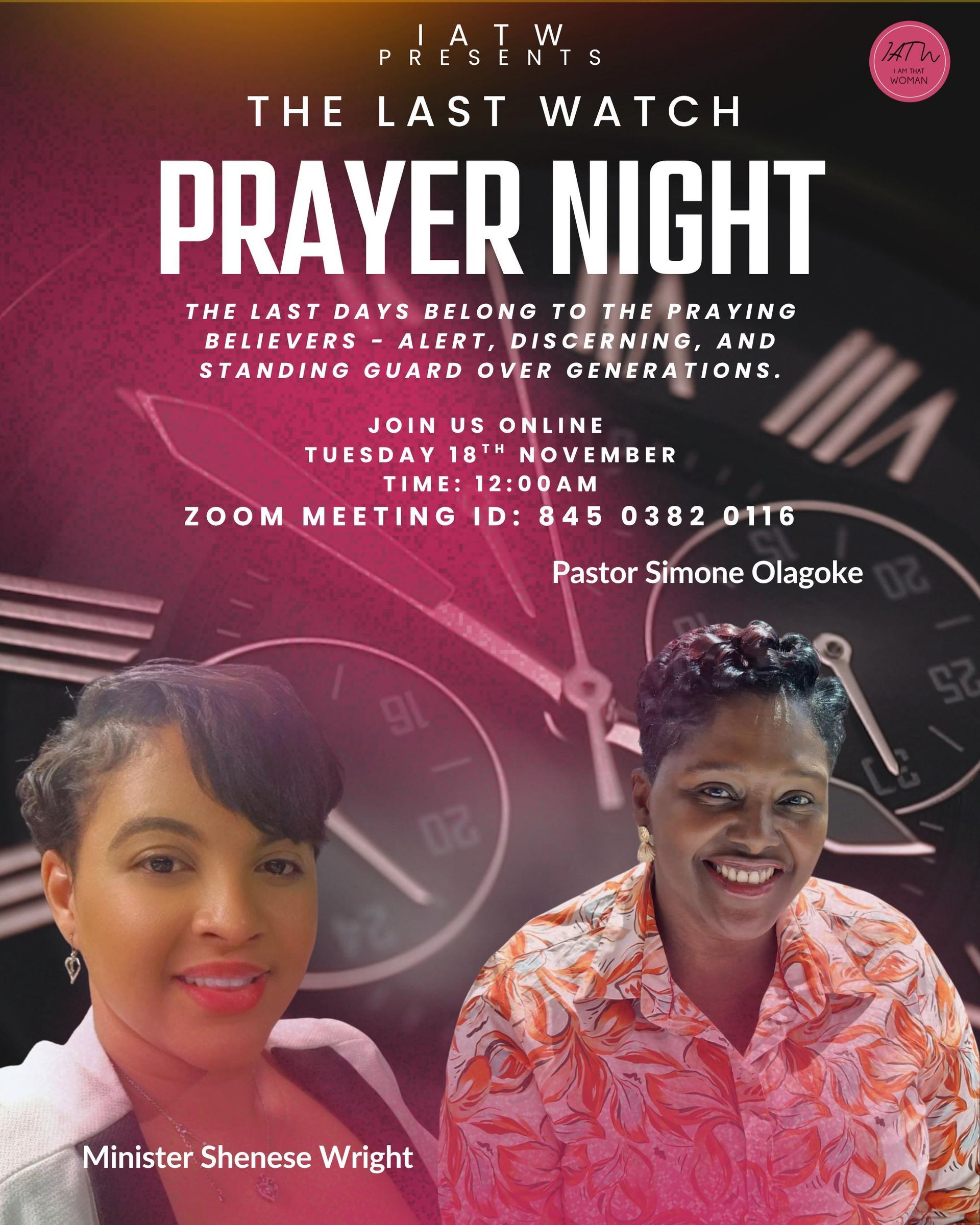 Join Pastor Simone and Minister Shenese on Tuesday 18th November at midnight for our prayer night. Zoom meeting ID: 845 0322 0116